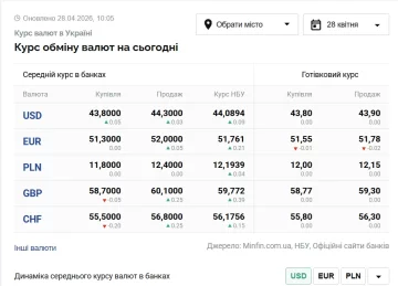 По состоянию на 28 апреля 2026 года , по данным валютных рынков, установлены следующие курсы основных валют к украинской гривне (UAH):